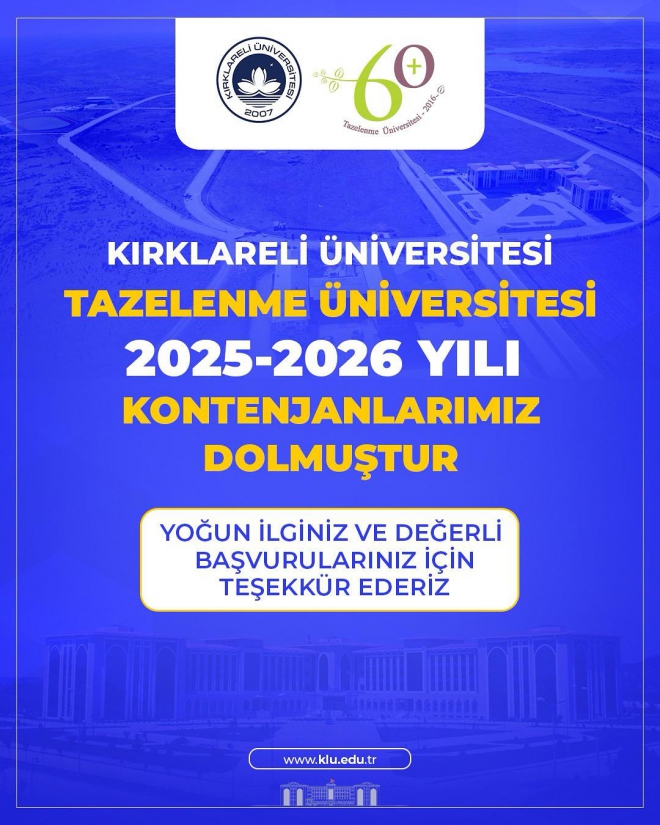Kırklareli 60+ Tazelenme Üniversitesi 2025-2026 eğitim-öğretim yılı kontenjanlarımız dolmuştur. Yoğun ilgi ve değerli başvuruları için tüm vatandaşlarımıza çok teşekkür ederiz.