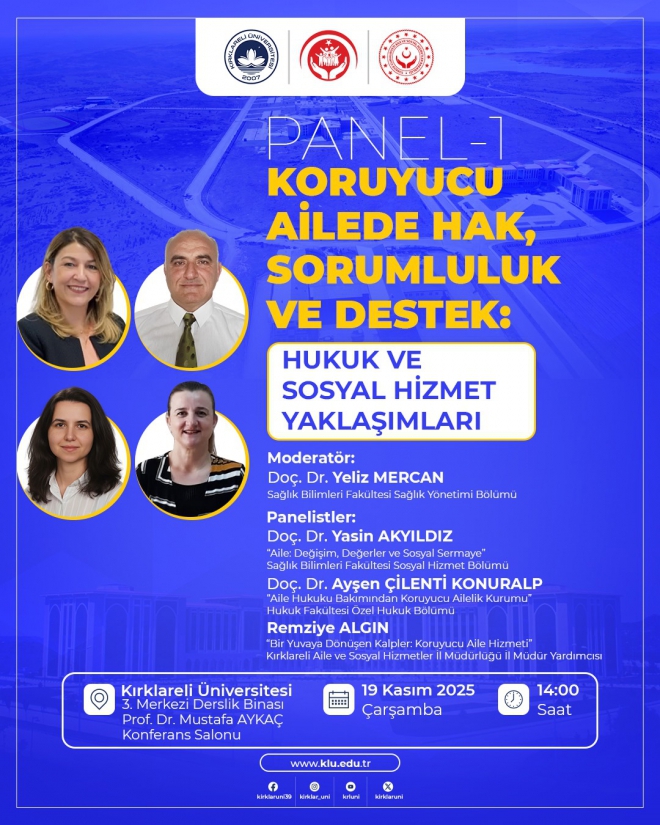 Üniversitemiz ile Kırklareli Aile ve Sosyal Hizmetler İl Müdürlüğü iş birliğiyle 2025 Aile Yılı etkinlikleri kapsamında “Koruyucu Ailede Hak, Sorumluluk ve Destek: Hukuk ve Sosyal Hizmet Yaklaşımları” başlıklı panel düzenlenecektir.